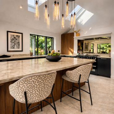 Kitchen extension and redesign, introducing a bar and snug area and opening up the layout to the outdoors to maximise natural light and create a brighter more connected space.